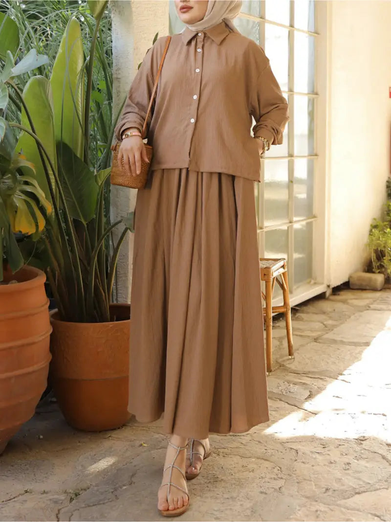 Composé d’un chemisier boutonné élégant et d’une jupe fluide à ourlet froncé, cet ensemble offre une allure féminine et raffinée.