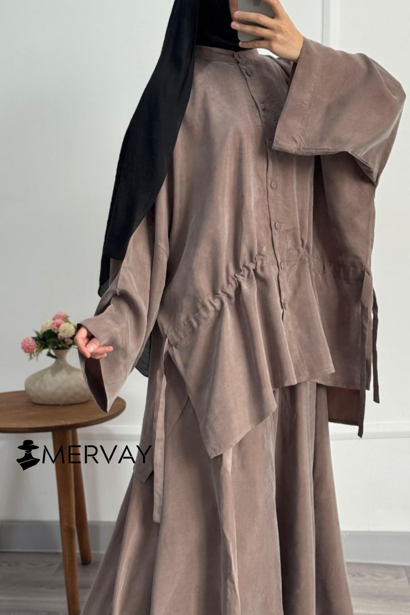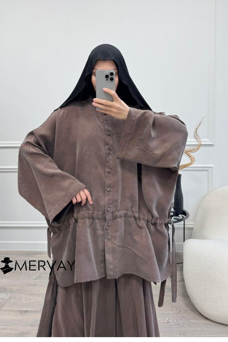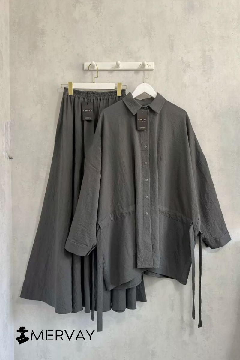 Conçu dans un tissu fluide effet daim satiné, cet ensemble deux pièces se compose d’une chemise oversize boutonnée à cordon de serrage ajustable et d’une jupe longue fluide assortie.